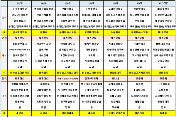 11월넷째주식단표 페이지 정보 작성자 은천노인복지회 작성일19-11-27 09:21 조회39,391회 댓글0건 관련링크 이전글 다음글 목록 답변 본문 ※ 모든 식사에는 잡곡밥과 김치가 제공됩니다. ※ 식단은 식재료수급에 의해 변경될 수 있습니다. 이전글 다음글 목록 답변