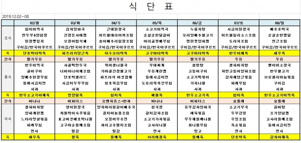 12월첫째주식단표 페이지 정보 작성자 은천노인복지회 작성일19-12-02 18:02 조회39,276회 댓글0건 관련링크 이전글 다음글 목록 답변 본문 ※ 모든 식사에는 잡곡밥과 김치가 제공됩니다. ※ 식단은 식재료수급에 의해 변경될 수 있습니다. 이전글 다음글 목록 답변