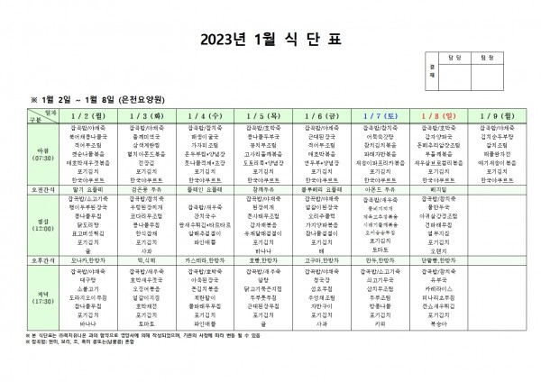 23년 1월 첫째주 식단표 페이지 정보 작성자 은천노인복지회 작성일22-12-30 15:21 조회86,721회 댓글0건 관련링크 이전글 다음글 목록 답변 본문 . 이전글 다음글 목록 답변