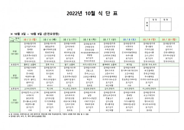 10월 첫째주 식단표 페이지 정보 작성자 은천노인복지회 작성일22-10-04 09:59 조회96,181회 댓글0건 관련링크 이전글 다음글 목록 답변 본문 . 이전글 다음글 목록 답변