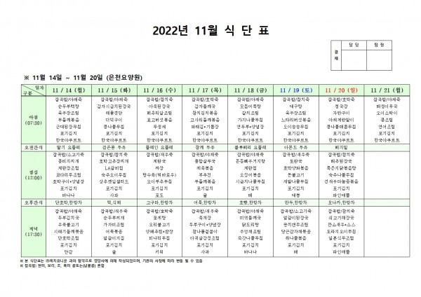 11월 셋째주 식단표 페이지 정보 작성자 은천노인복지회 작성일22-11-10 10:10 조회92,198회 댓글0건 관련링크 이전글 다음글 목록 답변 본문 . 이전글 다음글 목록 답변