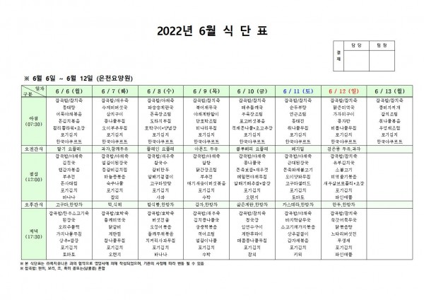 6월 둘째주 식단표 페이지 정보 작성자 은천노인복지회 작성일22-06-03 09:34 조회104,764회 댓글0건 관련링크 이전글 다음글 목록 답변 본문 . 이전글 다음글 목록 답변