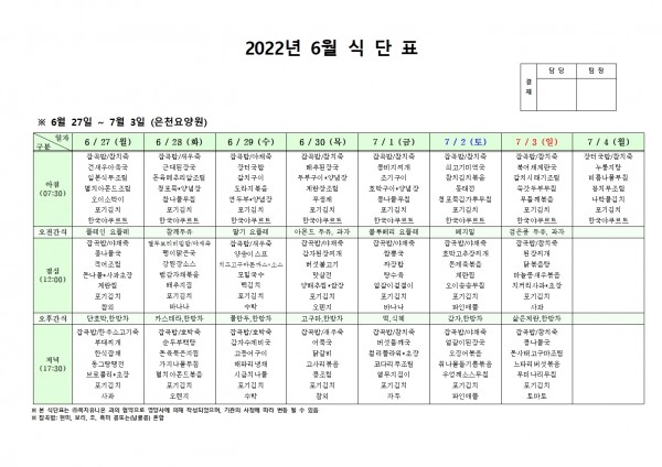 6월 넷째주 식단표 페이지 정보 작성자 은천노인복지회 작성일22-06-23 17:38 조회102,584회 댓글0건 관련링크 이전글 다음글 목록 답변 본문 . 이전글 다음글 목록 답변