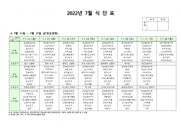 7월 둘째주 식단표 페이지 정보 작성자 은천노인복지회 작성일22-07-07 17:19 조회101,968회 댓글0건 관련링크 이전글 다음글 목록 답변 본문 . 이전글 다음글 목록 답변