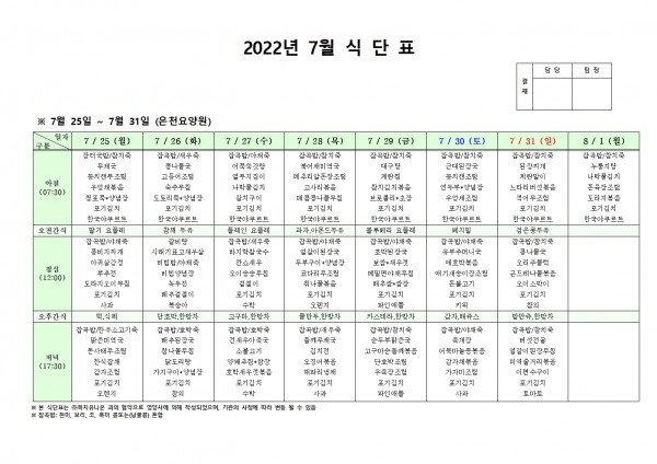 7월 넷째주 식단표 페이지 정보 작성자 은천노인복지회 작성일22-07-21 17:04 조회102,409회 댓글0건 관련링크 이전글 다음글 목록 답변 본문 . 이전글 다음글 목록 답변