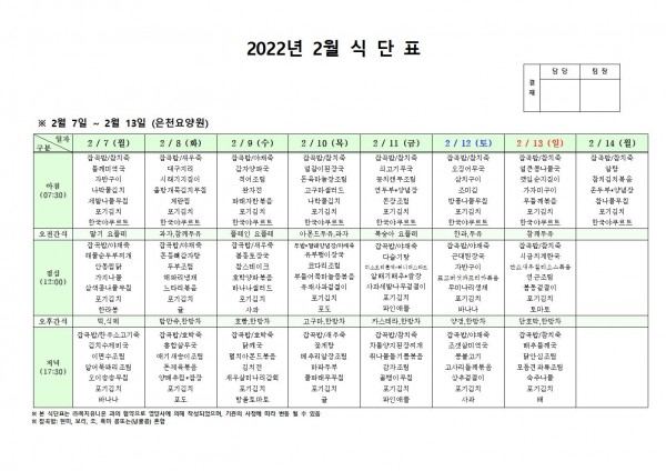 2월 둘째주 식단표 페이지 정보 작성자 은천노인복지회 작성일22-02-04 18:58 조회120,100회 댓글0건 관련링크 이전글 다음글 목록 답변 본문 . 이전글 다음글 목록 답변