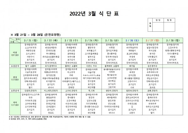 3월 넷째주 식단표 페이지 정보 작성자 은천노인복지회 작성일22-03-17 17:31 조회113,977회 댓글0건 관련링크 이전글 다음글 목록 답변 본문 . 이전글 다음글 목록 답변