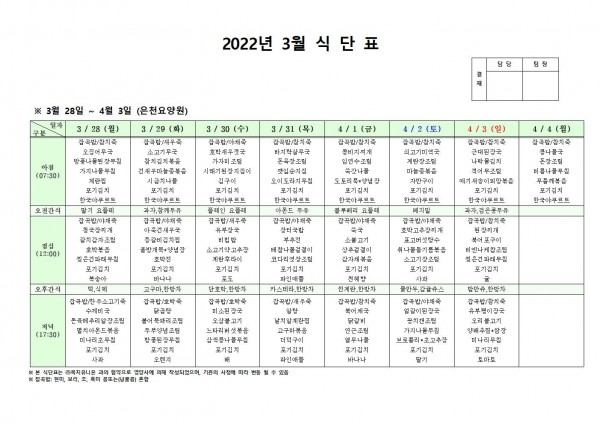 3월 다섯째주 식단표 페이지 정보 작성자 은천노인복지회 작성일22-03-25 10:40 조회113,519회 댓글0건 관련링크 이전글 다음글 목록 답변 본문 . 이전글 다음글 목록 답변