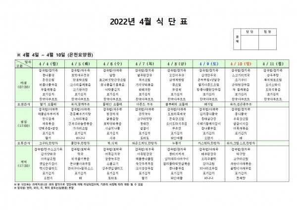 4월 첫째주 식단표 페이지 정보 작성자 은천노인복지회 작성일22-04-01 11:35 조회112,411회 댓글0건 관련링크 이전글 다음글 목록 답변 본문 . 이전글 다음글 목록 답변