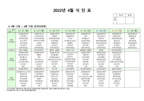 4월 둘째주 식단표 페이지 정보 작성자 은천노인복지회 작성일22-04-11 16:27 조회111,881회 댓글0건 관련링크 이전글 다음글 목록 답변 본문 . 이전글 다음글 목록 답변