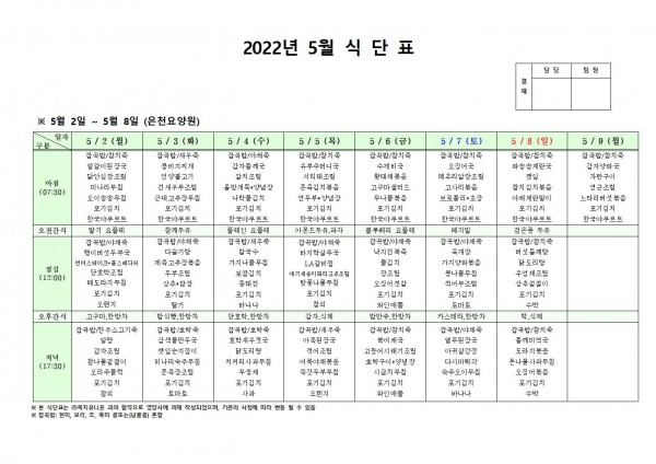 5월 첫째주 식단표 페이지 정보 작성자 은천노인복지회 작성일22-04-29 10:35 조회108,744회 댓글0건 관련링크 이전글 다음글 목록 답변 본문 . 이전글 다음글 목록 답변