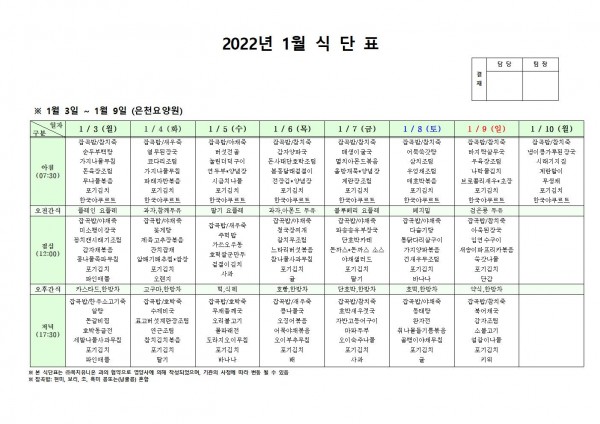 2022년 1월 첫째주 식단표 페이지 정보 작성자 은천노인복지회 작성일21-12-30 17:37 조회122,433회 댓글0건 관련링크 이전글 다음글 목록 답변 본문 . 이전글 다음글 목록 답변