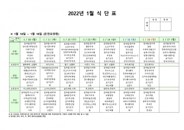 1월 둘째주 식단표 페이지 정보 작성자 은천노인복지회 작성일22-01-07 10:03 조회121,855회 댓글0건 관련링크 이전글 다음글 목록 답변 본문 . 이전글 다음글 목록 답변