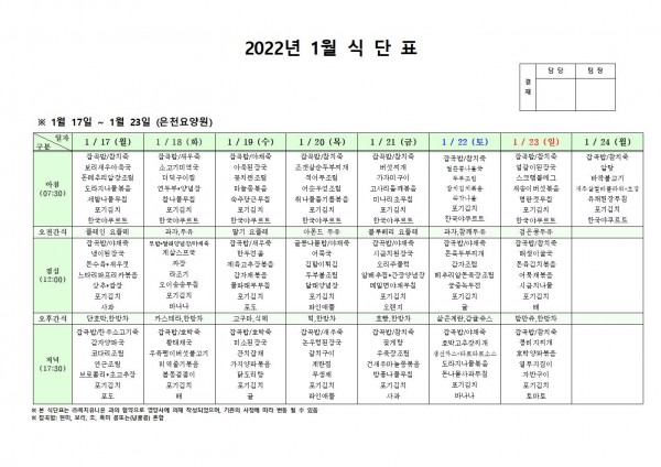 1월 셋째주 식단표 페이지 정보 작성자 은천노인복지회 작성일22-01-25 09:24 조회120,729회 댓글0건 관련링크 이전글 다음글 목록 답변 본문 . 이전글 다음글 목록 답변