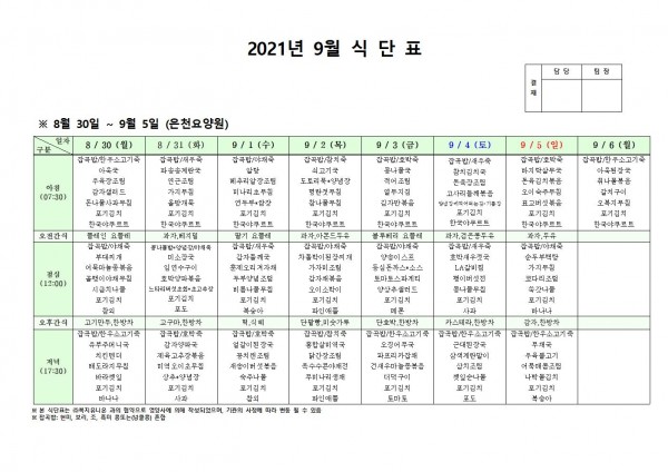 9월 첫째주 식단표 페이지 정보 작성자 은천노인복지회 작성일21-08-26 17:14 조회129,486회 댓글0건 관련링크 이전글 다음글 목록 답변 본문 . 이전글 다음글 목록 답변