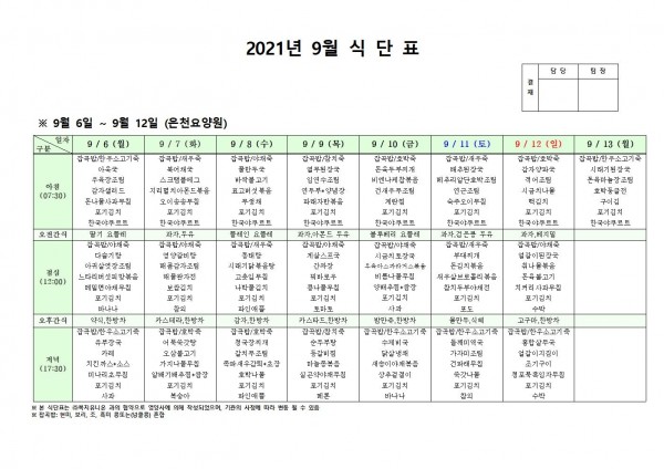 9월 둘째주 식단표 페이지 정보 작성자 은천노인복지회 작성일21-09-02 16:30 조회129,316회 댓글0건 관련링크 이전글 다음글 목록 답변 본문 . 이전글 다음글 목록 답변