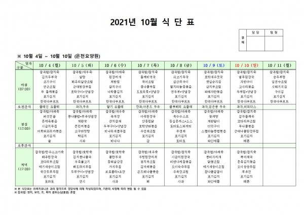 10월 첫째주 식단표 페이지 정보 작성자 은천노인복지회 작성일21-09-30 16:01 조회127,998회 댓글0건 관련링크 이전글 다음글 목록 답변 본문 . 이전글 다음글 목록 답변