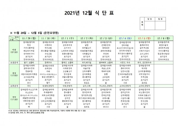 12월 첫째주 식단표 페이지 정보 작성자 은천노인복지회 작성일21-11-25 17:12 조회125,189회 댓글0건 관련링크 이전글 다음글 목록 답변 본문 . 이전글 다음글 목록 답변