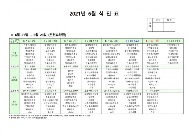 6월 넷째주 식단표 페이지 정보 작성자 은천노인복지회 작성일21-06-17 15:01 조회134,174회 댓글0건 관련링크 이전글 다음글 목록 답변 본문 . 이전글 다음글 목록 답변