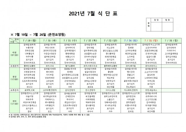 7월 셋째주 식단표 페이지 정보 작성자 은천노인복지회 작성일21-07-22 11:18 조회133,214회 댓글0건 관련링크 이전글 다음글 목록 답변 본문 . 이전글 다음글 목록 답변