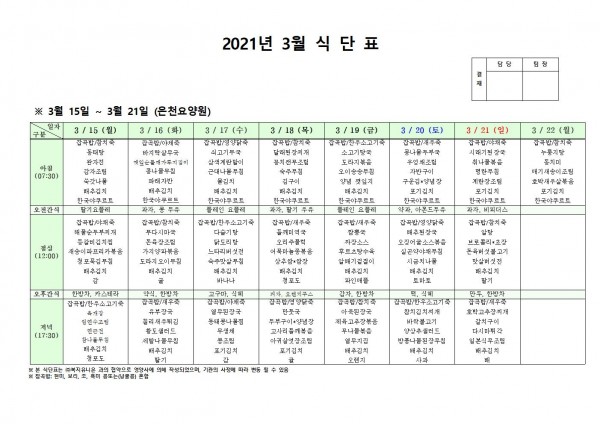 3월 셋째주 식단표 페이지 정보 작성자 은천노인복지회 작성일21-03-12 11:41 조회144,272회 댓글0건 관련링크 이전글 다음글 목록 답변 본문 3월 셋째주 식단표[이 게시물은 은천노인복지회님에 의해 2021-03-12 17:18:24 공지사항에서 이동 됨] 이전글 다음글 목록 답변