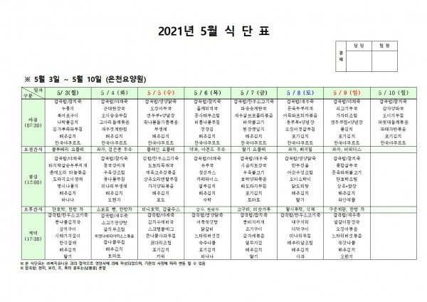 5월 첫째주 식단표 페이지 정보 작성자 은천노인복지회 작성일21-05-03 13:44 조회138,696회 댓글0건 관련링크 이전글 다음글 목록 답변 본문 5월 식단표 이전글 다음글 목록 답변