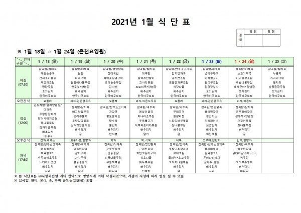 1월 셋째주 식단표 페이지 정보 작성자 은천노인복지회 작성일21-01-15 10:02 조회148,647회 댓글0건 관련링크 이전글 다음글 목록 답변 본문 . 이전글 다음글 목록 답변