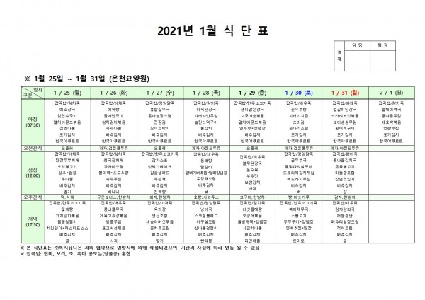 1월 넷째주 식단표 페이지 정보 작성자 은천노인복지회 작성일21-01-22 10:43 조회148,888회 댓글0건 관련링크 이전글 다음글 목록 답변 본문 . 이전글 다음글 목록 답변