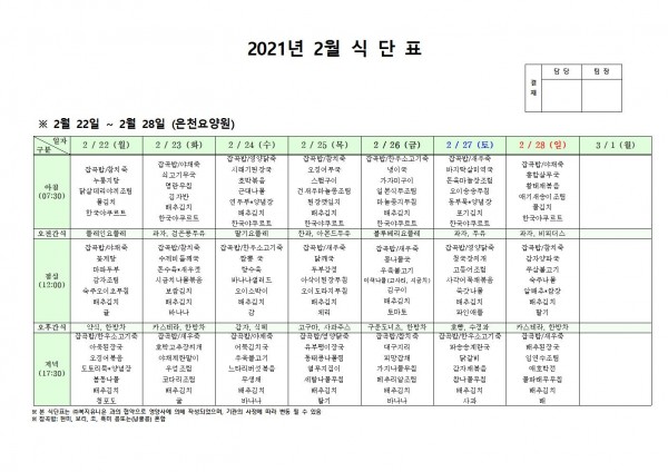 2월 넷째주 식단표 페이지 정보 작성자 은천노인복지회 작성일21-02-19 12:05 조회145,748회 댓글0건 관련링크 이전글 다음글 목록 답변 본문 2월 4주 식단표 [이 게시물은 은천노인복지회님에 의해 2021-03-12 17:18:24 공지사항에서 이동 됨] 이전글 다음글 목록 답변