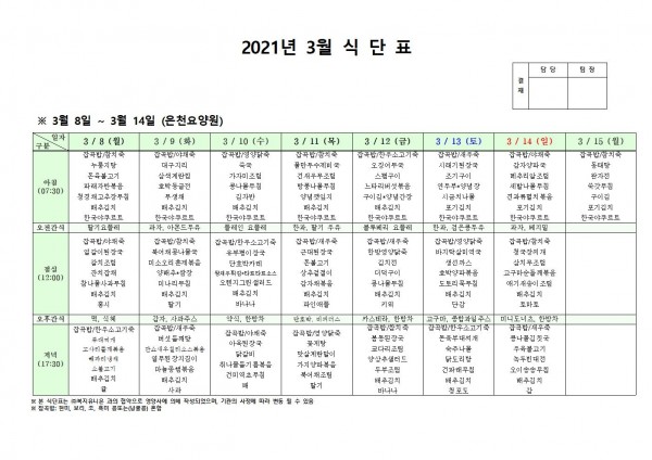 3월 둘째주 식단표 페이지 정보 작성자 은천노인복지회 작성일21-03-04 17:55 조회144,732회 댓글0건 관련링크 이전글 다음글 목록 답변 본문 3월 식단표 [이 게시물은 은천노인복지회님에 의해 2021-03-12 17:18:24 공지사항에서 이동 됨] 이전글 다음글 목록 답변