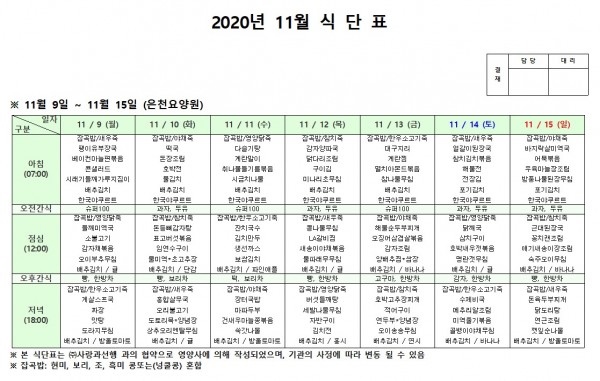 11월 둘째주 식단표 페이지 정보 작성자 은천노인복지회 작성일20-12-08 18:09 조회155,500회 댓글0건 관련링크 이전글 다음글 목록 답변 본문 11월 둘째주 식단표 이전글 다음글 목록 답변