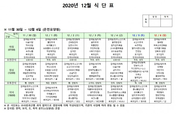 12월 첫째주 식단표 페이지 정보 작성자 은천노인복지회 작성일20-12-08 18:10 조회154,278회 댓글0건 관련링크 이전글 다음글 목록 답변 본문 . 이전글 다음글 목록 답변
