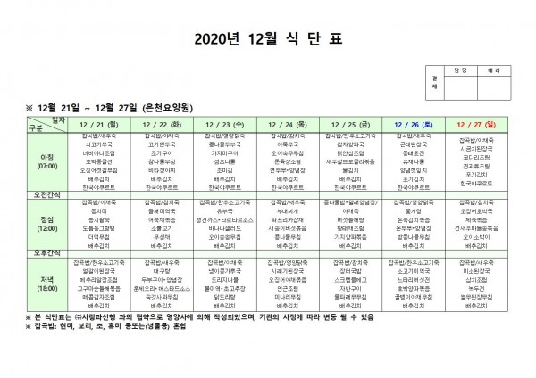 12월 넷째주 식단표 페이지 정보 작성자 은천노인복지회 작성일20-12-21 17:39 조회153,381회 댓글0건 관련링크 이전글 다음글 목록 답변 본문 . 이전글 다음글 목록 답변