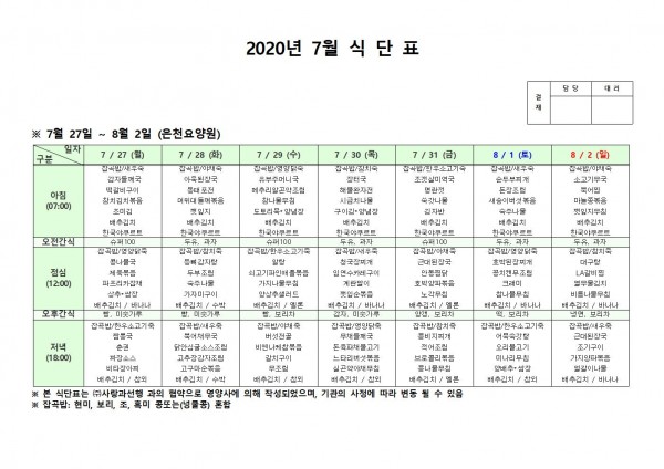 7월 다섯째주 식단표 페이지 정보 작성자 은천노인복지회 작성일20-08-10 11:32 조회165,705회 댓글0건 관련링크 이전글 다음글 목록 답변 본문 . 이전글 다음글 목록 답변