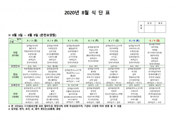 8월 첫째주 식단표 페이지 정보 작성자 은천노인복지회 작성일20-08-10 11:33 조회164,876회 댓글0건 관련링크 이전글 다음글 목록 답변 본문 , 이전글 다음글 목록 답변