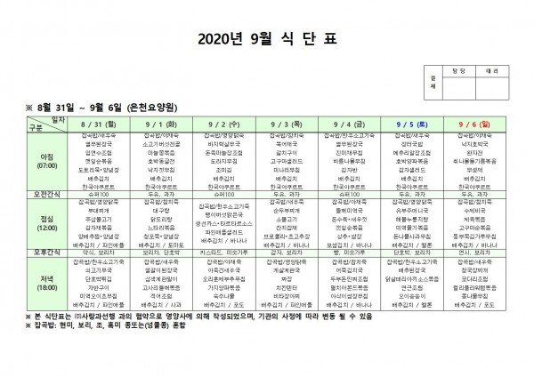 9월 첫째주 식단표 페이지 정보 작성자 은천노인복지회 작성일20-09-07 14:40 조회163,125회 댓글0건 관련링크 이전글 다음글 목록 답변 본문 * 이전글 다음글 목록 답변