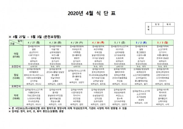 4월 넷째주 식단표 페이지 정보 작성자 은천노인복지회 작성일20-05-04 15:11 조회175,148회 댓글0건 관련링크 이전글 다음글 목록 답변 본문 . 이전글 다음글 목록 답변
