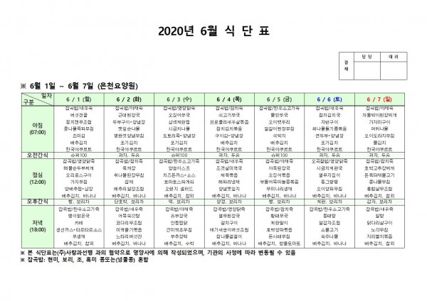 6월 첫째주 식단표 페이지 정보 작성자 은천노인복지회 작성일20-06-09 09:32 조회171,076회 댓글0건 관련링크 이전글 다음글 목록 답변 본문 호 이전글 다음글 목록 답변