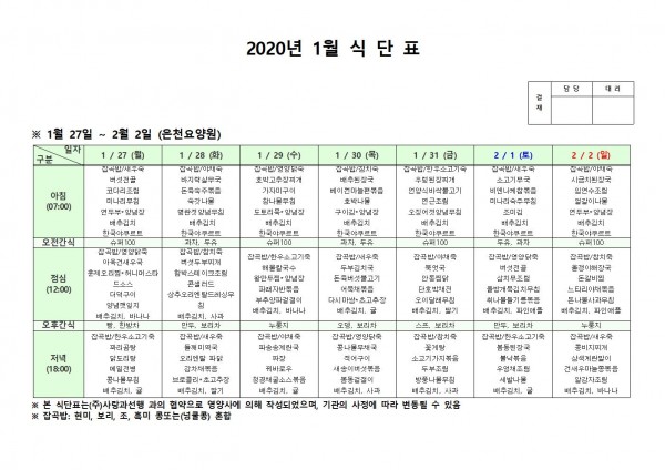 1월 넷째주 식단표 페이지 정보 작성자 은천노인복지회 작성일20-02-04 09:37 조회184,573회 댓글0건 관련링크 이전글 다음글 목록 답변 본문 1월 넷째주 식단표입니다. 이전글 다음글 목록 답변
