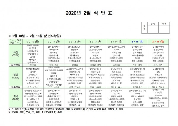 2월 둘째주 식단표 페이지 정보 작성자 은천노인복지회 작성일20-02-17 10:27 조회182,248회 댓글0건 관련링크 이전글 다음글 목록 답변 본문 ㅇㅅㅇ 이전글 다음글 목록 답변
