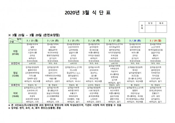 3월 넷째주 식단표 페이지 정보 작성자 은천노인복지회 작성일20-03-31 16:09 조회180,309회 댓글0건 관련링크 이전글 다음글 목록 답변 본문 . 이전글 다음글 목록 답변