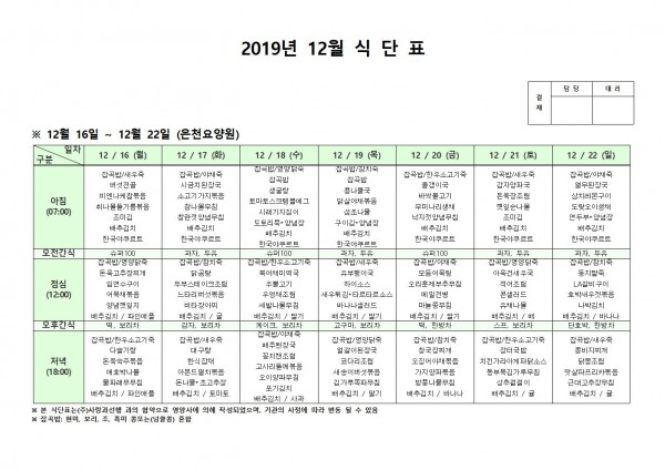 12월 셋째주 식단표 페이지 정보 작성자 은천노인복지회 작성일19-12-23 14:06 조회188,880회 댓글0건 관련링크 이전글 다음글 목록 답변 본문 12월 셋째주 식단표입니다. 이전글 다음글 목록 답변