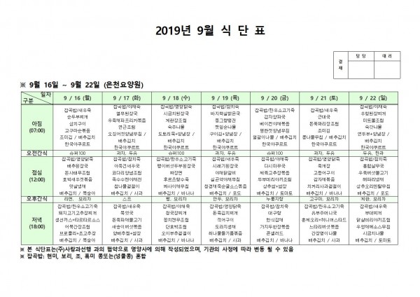 9월 셋째주 식단표 페이지 정보 작성자 은천노인복지회 작성일19-09-23 13:27 조회196,490회 댓글0건 관련링크 이전글 다음글 목록 답변 본문 . 이전글 다음글 목록 답변