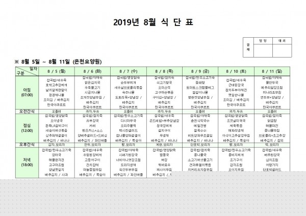 8월 둘째주 식단표 페이지 정보 작성자 은천노인복지회 작성일19-08-19 15:26 조회197,900회 댓글0건 관련링크 이전글 다음글 목록 답변 본문 8월 둘째주 식단표 이전글 다음글 목록 답변