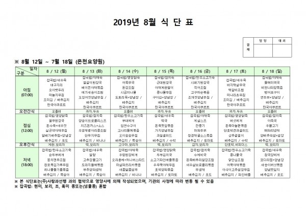 8월 셋째주 식단표 페이지 정보 작성자 은천노인복지회 작성일19-08-19 15:35 조회197,339회 댓글0건 관련링크 이전글 다음글 목록 답변 본문 8월 셋째주 식단표 이전글 다음글 목록 답변