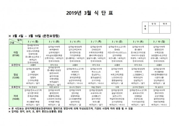 3월 첫째주 식단표 페이지 정보 작성자 은천노인복지회 작성일19-03-13 09:44 조회206,823회 댓글0건 관련링크 이전글 다음글 목록 답변 본문 3월 첫째주 식단표 이전글 다음글 목록 답변