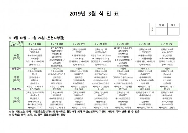 3월 셋째주 식단표 페이지 정보 작성자 은천노인복지회 작성일19-03-25 11:11 조회205,954회 댓글0건 관련링크 이전글 다음글 목록 답변 본문 3월 셋째주 식단표 이전글 다음글 목록 답변