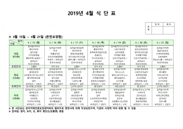 4월 셋째주 식단표 페이지 정보 작성자 은천노인복지회 작성일19-04-22 13:22 조회206,224회 댓글0건 관련링크 이전글 다음글 목록 답변 본문 4월 셋째주 식단표 이전글 다음글 목록 답변