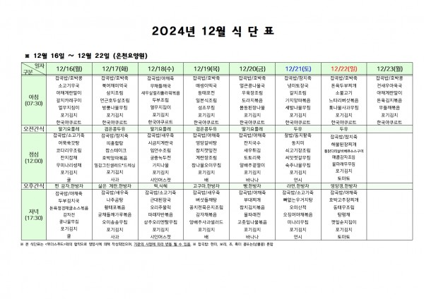 12월 셋째주 식단표 페이지 정보 작성자 은천노인복지회 작성일24-12-13 09:36 조회20,263회 댓글0건 관련링크 이전글 다음글 목록 답변 본문 . 이전글 다음글 목록 답변