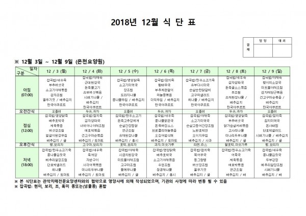 12월 첫째주 식단표 페이지 정보 작성자 은천노인복지회 작성일18-12-28 09:44 조회210,049회 댓글0건 관련링크 이전글 다음글 목록 답변 본문 12월 첫째주 식단표 이전글 다음글 목록 답변